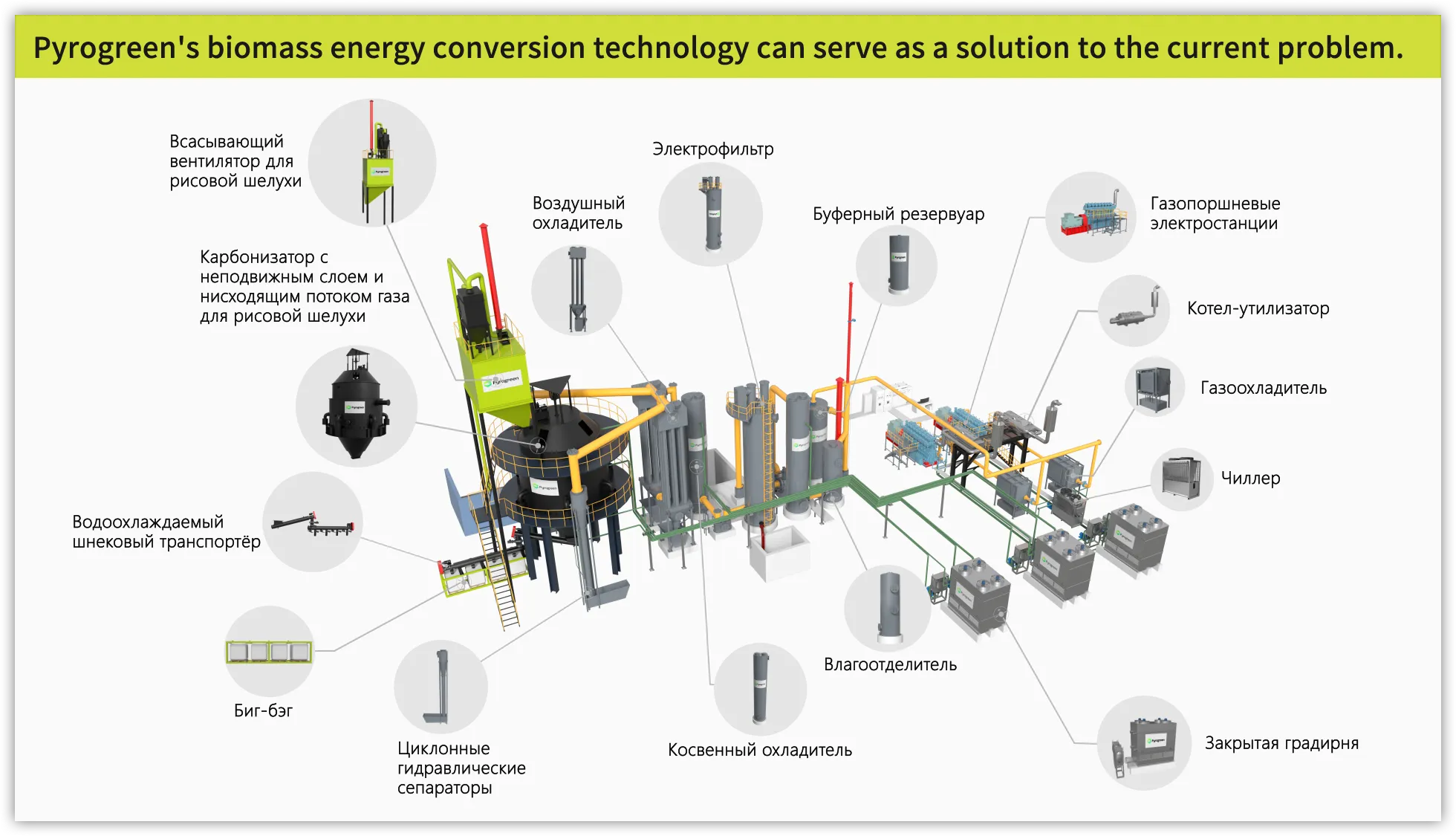 Отходы сельского и лесного хозяйства, такие как древесная щепа, тюки соломы, бамбуковая щепа, кукурузные початки, кокосовая скорлупа, биомассовые пеллеты и другие виды биомассы, подвергаются реакции пиролизной газификации в газификаторе с подачей бедного кислорода, производя горючий газ и биоуголь. Затем он используется в качестве топлива в газовом двигателе для выработки электроэнергии. Биоуголь используется в нашей повседневной жизни, промышленном и сельскохозяйственном производстве.