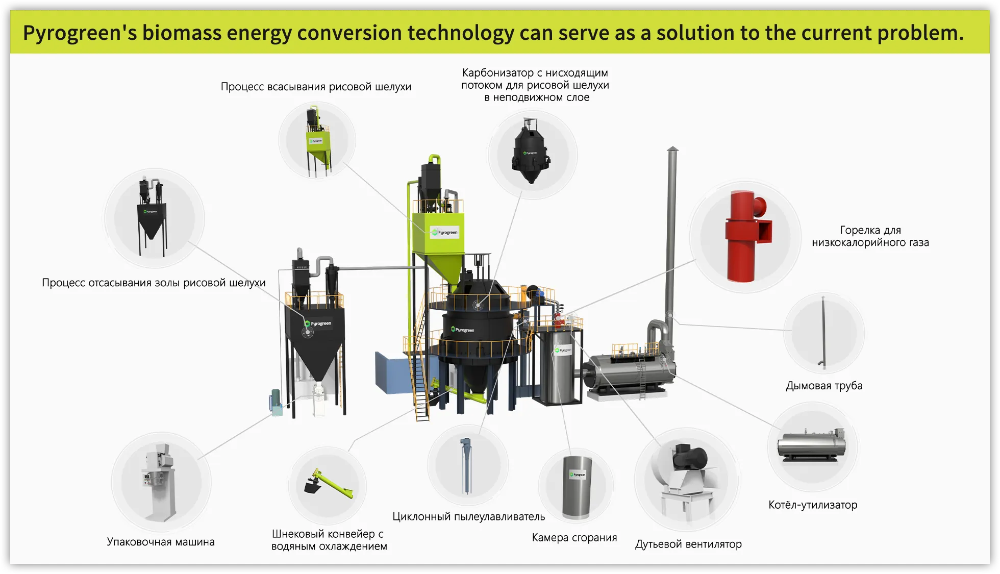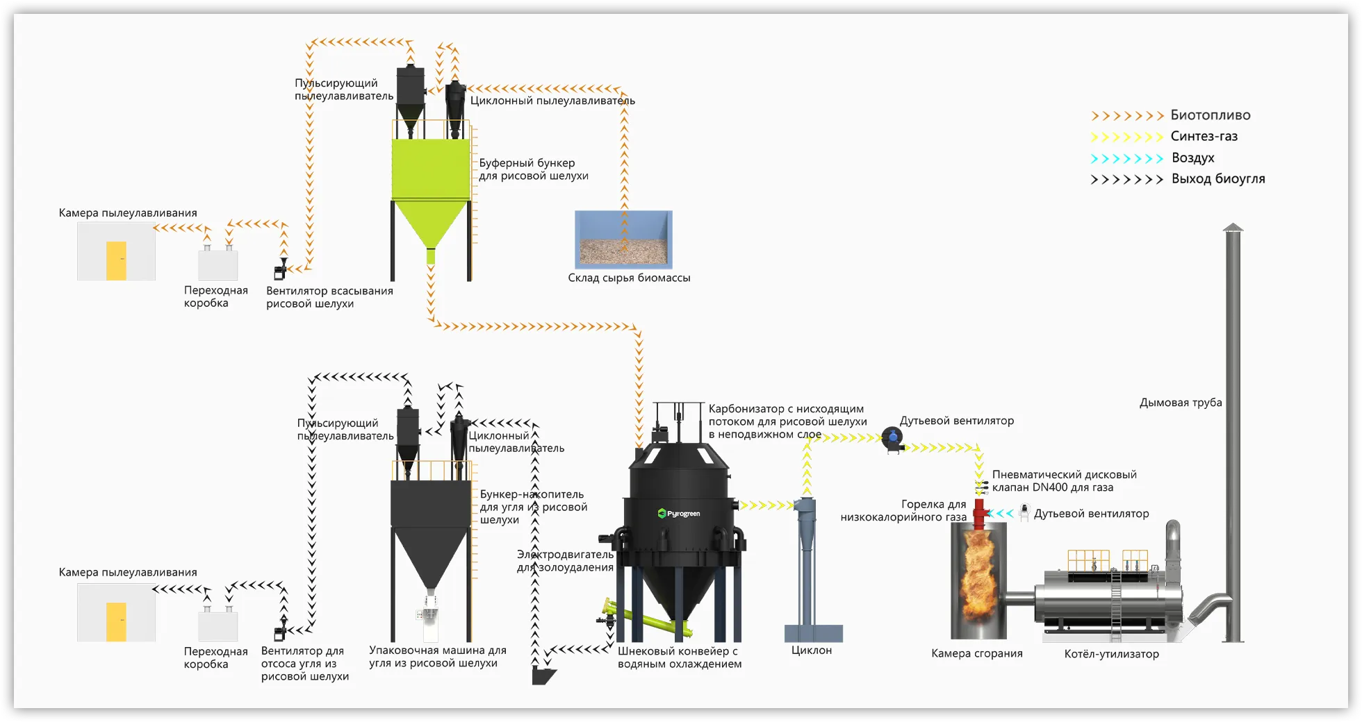 Сельскохозяйственные и лесные отходы, такие как древесная щепа, тюки соломы, бамбуковая щепа, кукурузные початки, кокосовая скорлупа, биомассные пеллеты и другая биомасса, подвергаются пиролизной газификации в газогенераторе при ограниченной подаче кислорода, производя горючий газ и биоуголь. Горючий газ, полученный из биомассы, напрямую транспортируется по трубам и сжигается в адиабатической печи для получения горячего дымового газа, тепло которого обменивается в котле-утилизаторе для производства пара (горячей воды) для бытового или промышленного использования. Биоуголь используется в нашей повседневной жизни, а также в промышленном и сельскохозяйственном производстве.