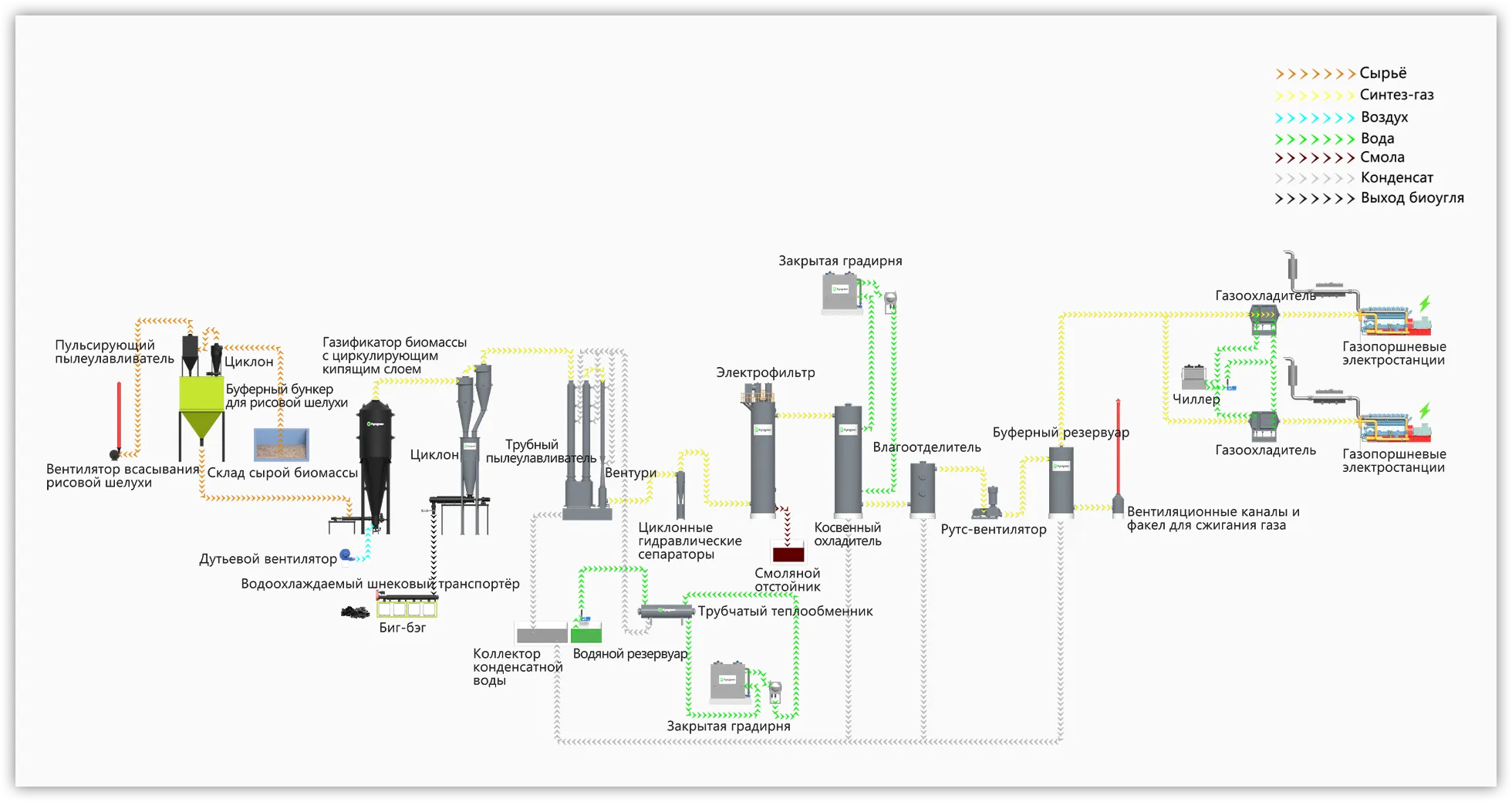 Сельскохозяйственные и лесные отходы, такие как древесная щепа, тюки соломы, бамбуковая щепа, кукурузные початки, кокосовая скорлупа, биомассные пеллеты и другая биомасса, подвергаются пиролизной газификации в газификаторе при ограниченной подаче кислорода, производя горючий газ и биоуголь. Затем он используется в качестве топлива в газовом двигателе для выработки электроэнергии. Биоуголь используется в нашей повседневной жизни, в промышленном и сельскохозяйственном производстве.